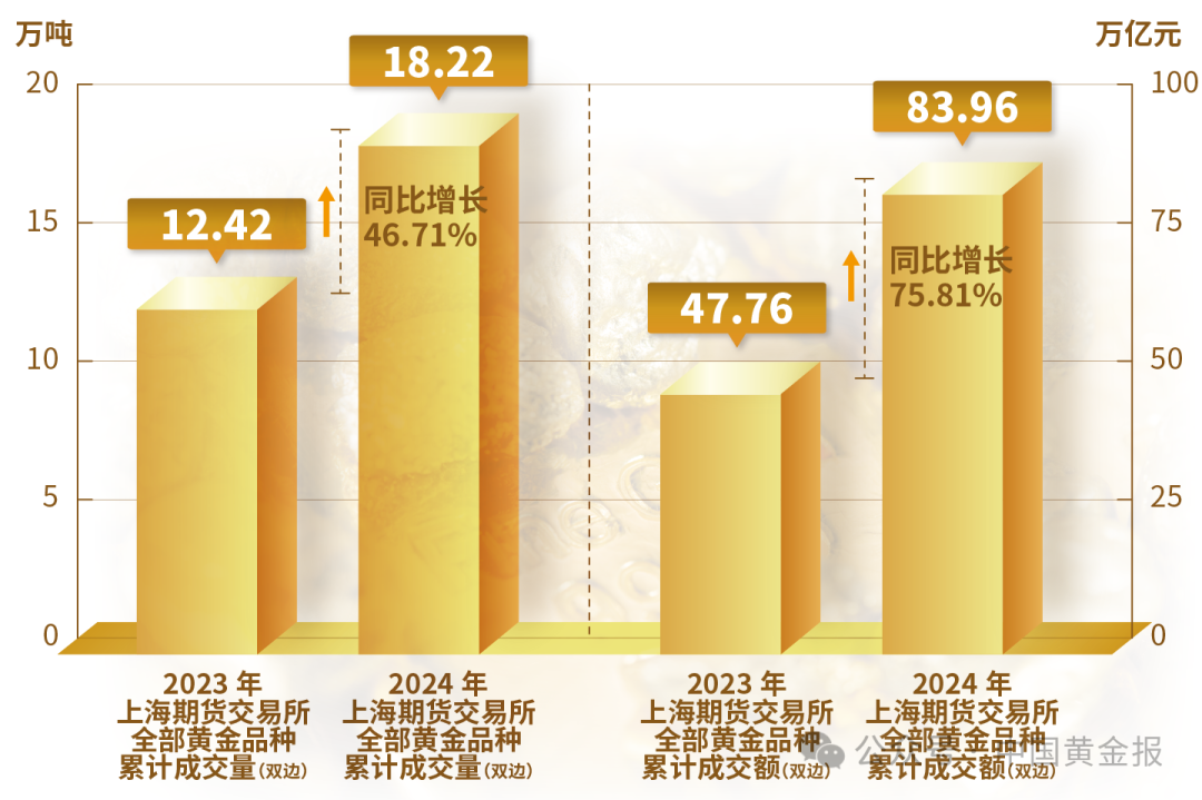 2024年,面對黃金價格波動,我國黃金市場呈現快速發展勢頭,黃金市場成交量、成交額大幅增長。上海黃金交易所全部黃金品種累計成交量雙邊6.23萬噸(單邊3.11萬噸),同比增長49.9%,成交額雙邊34.65萬億元(單邊17.33萬億元),同比增長86.65%;上海期貨交易所全部黃金品種累計成交量雙邊18.22萬噸(成交量單邊9.11萬噸),同比增長46.71%,成交額雙邊83.96萬億元(單邊41.98萬億元),同比增長75.81%。與此同時,上海黃金交易所和上海期貨交易所積極采取措施應對風險,完善交易制度,強化市場監管監測,保障了我國黃金市場的平穩健康運行。