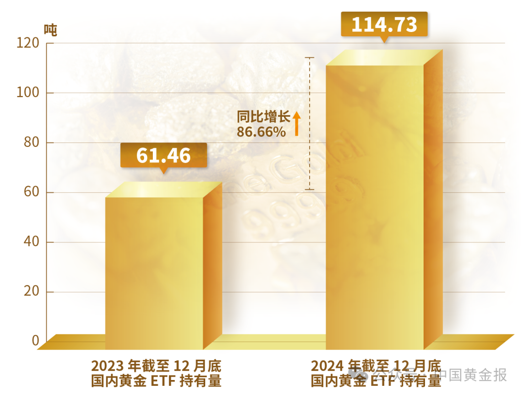 2024年,黃金ETF持倉規模呈快速增長趨勢。截至年底,國內黃金ETF持有量為114.73噸,比2023年底增加53.27噸,同比增長86.66%。
